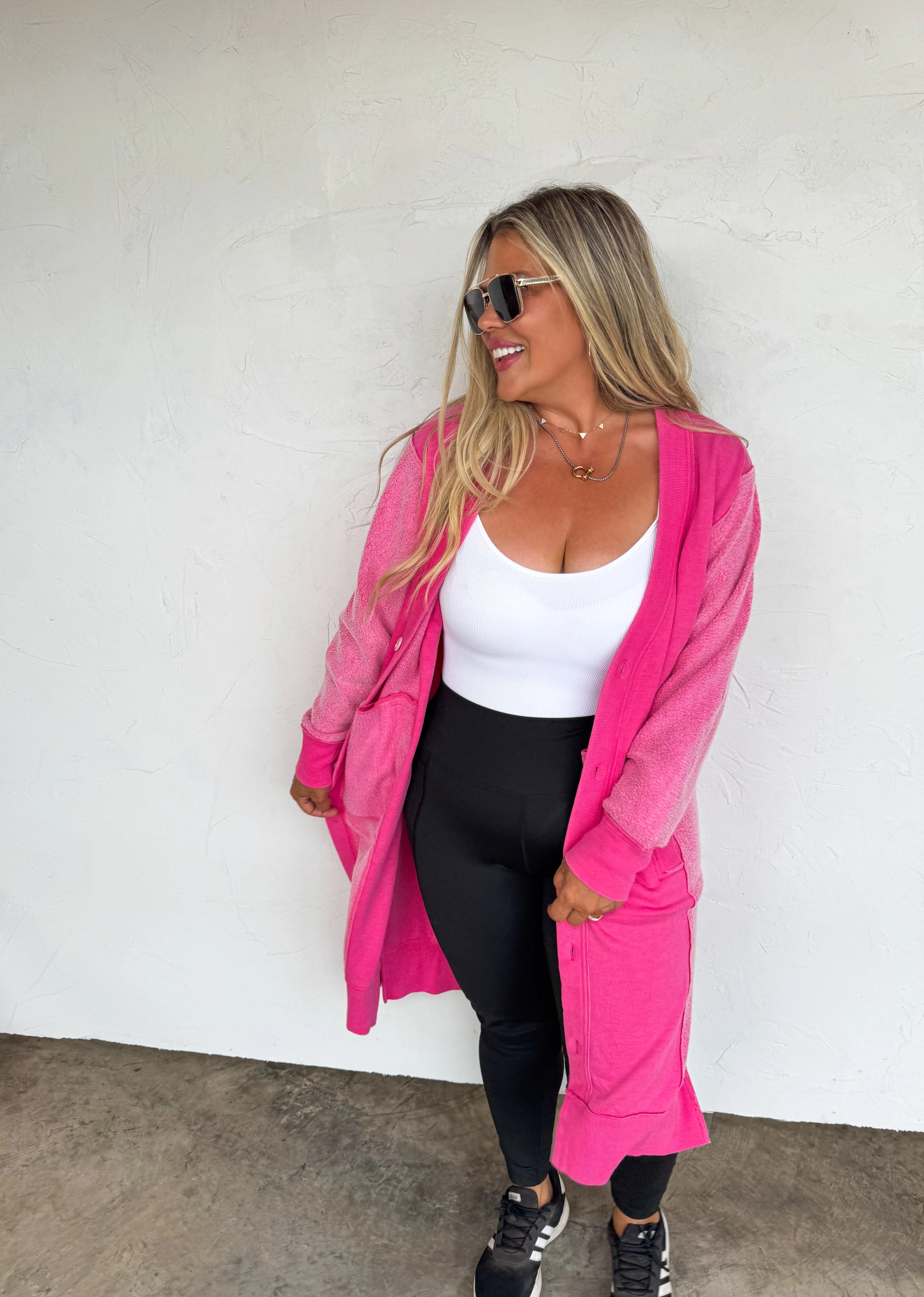 Made with luxurious DETAILING, this long cardigan features functional buttons, reverse fabric details on the sides, and pockets. Perfect for those chilly days, the luxury cardi adds style and practicality to your wardrobe. Relaxed fit and one size fits most.