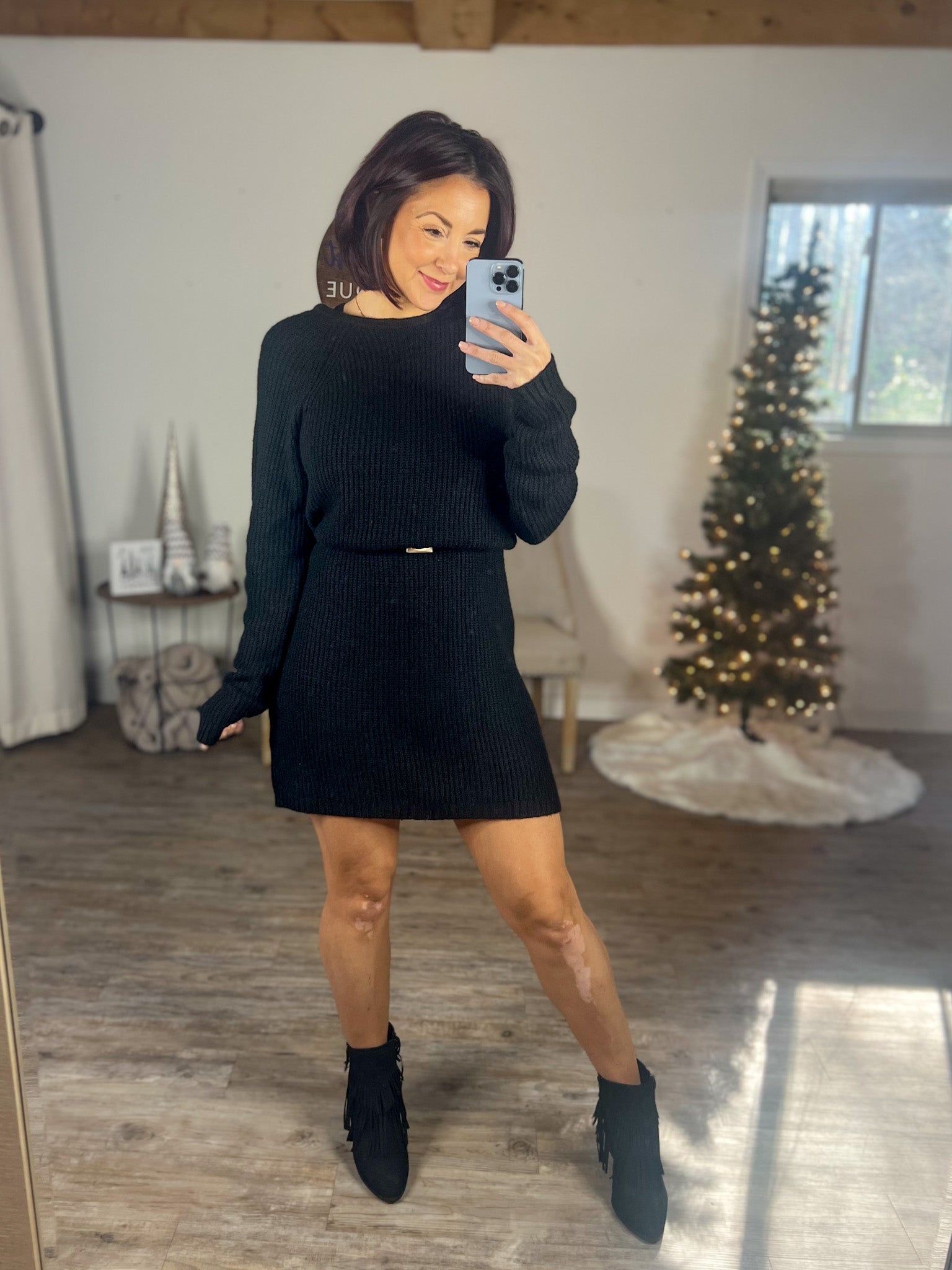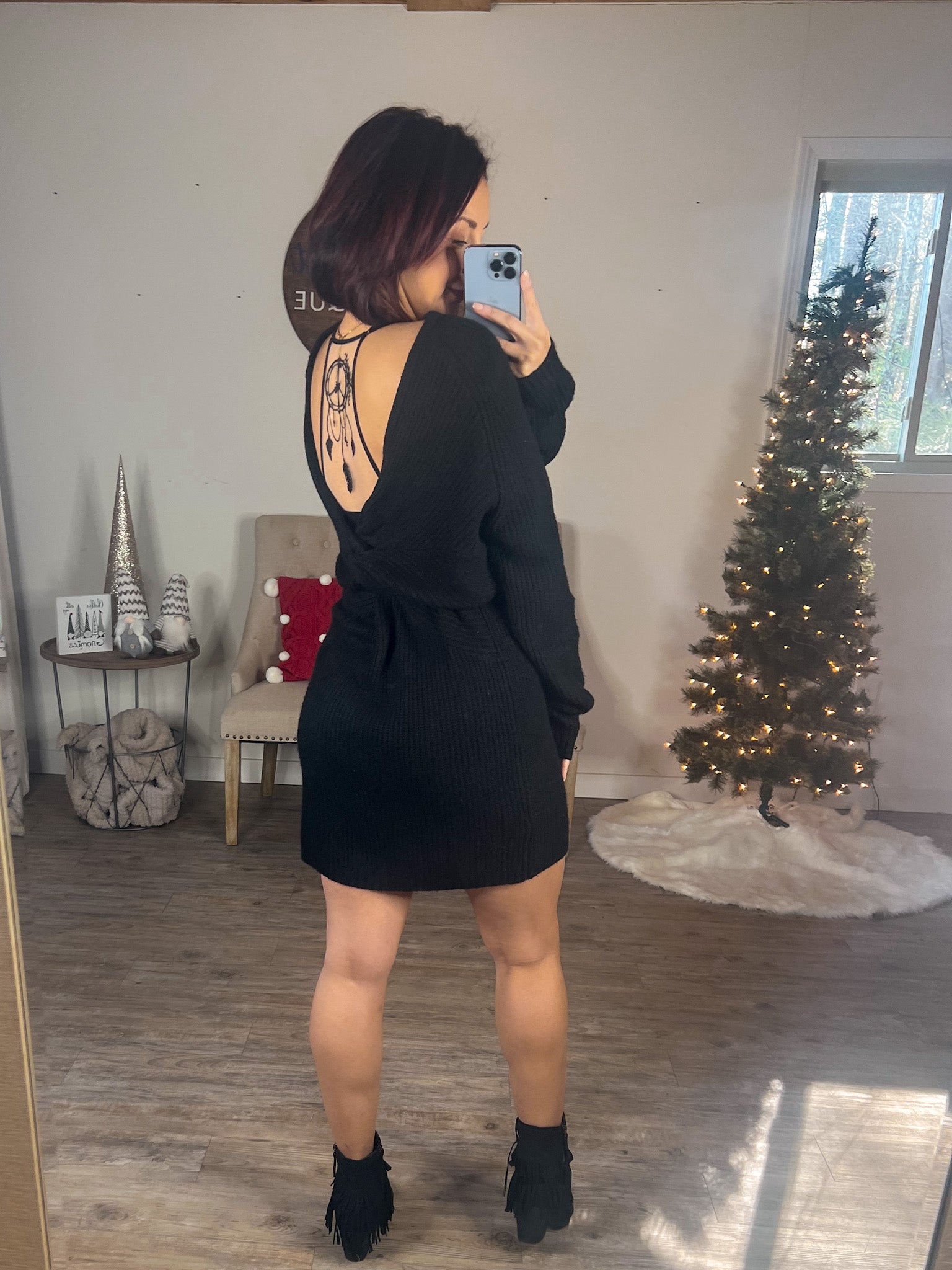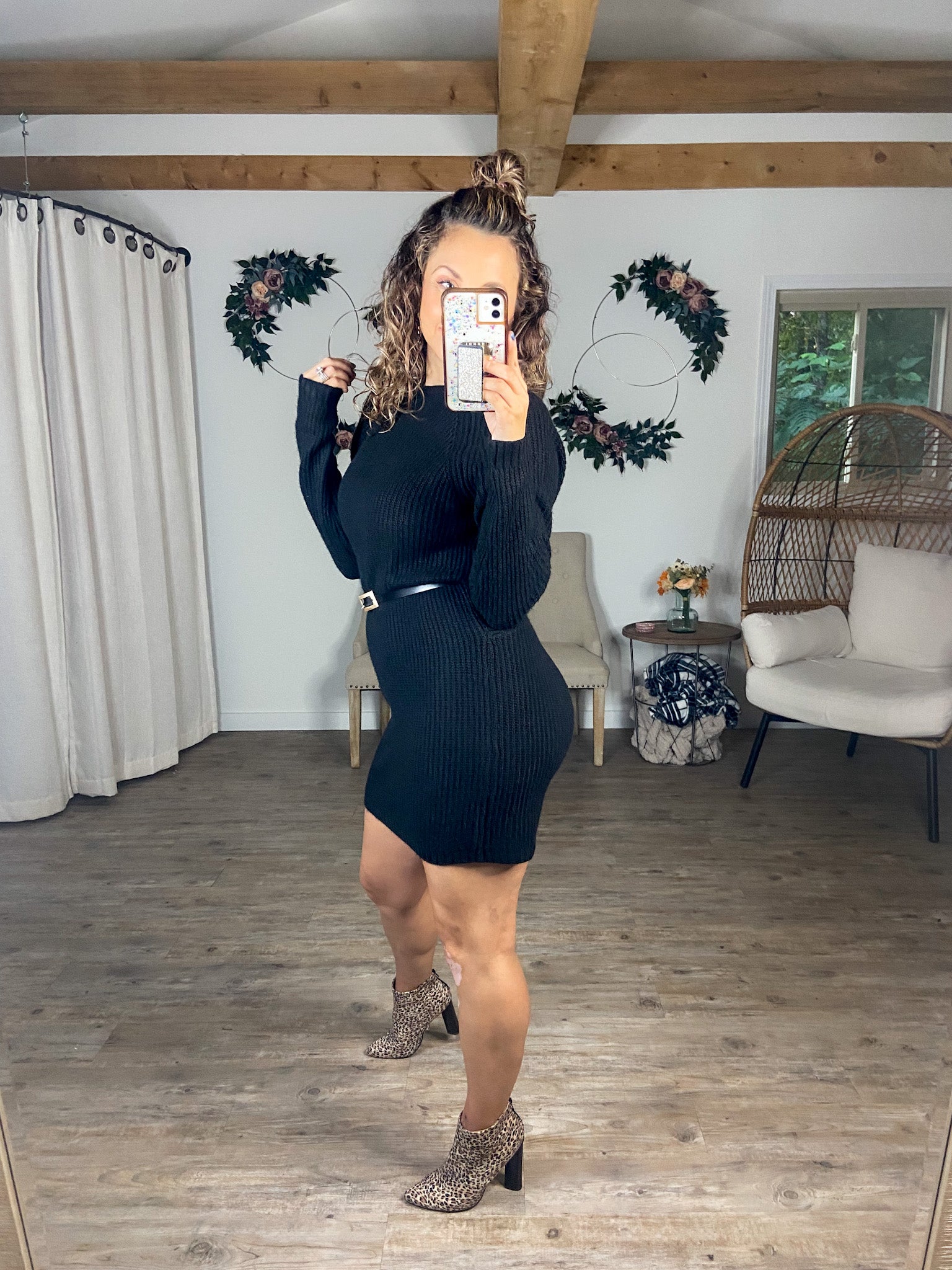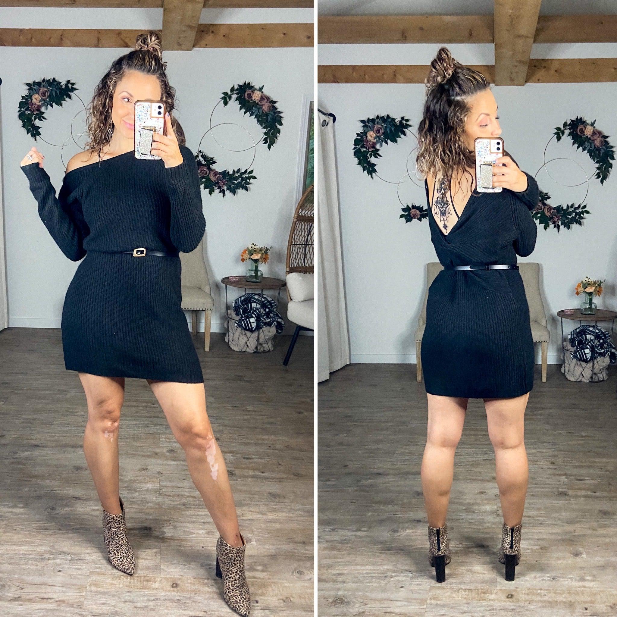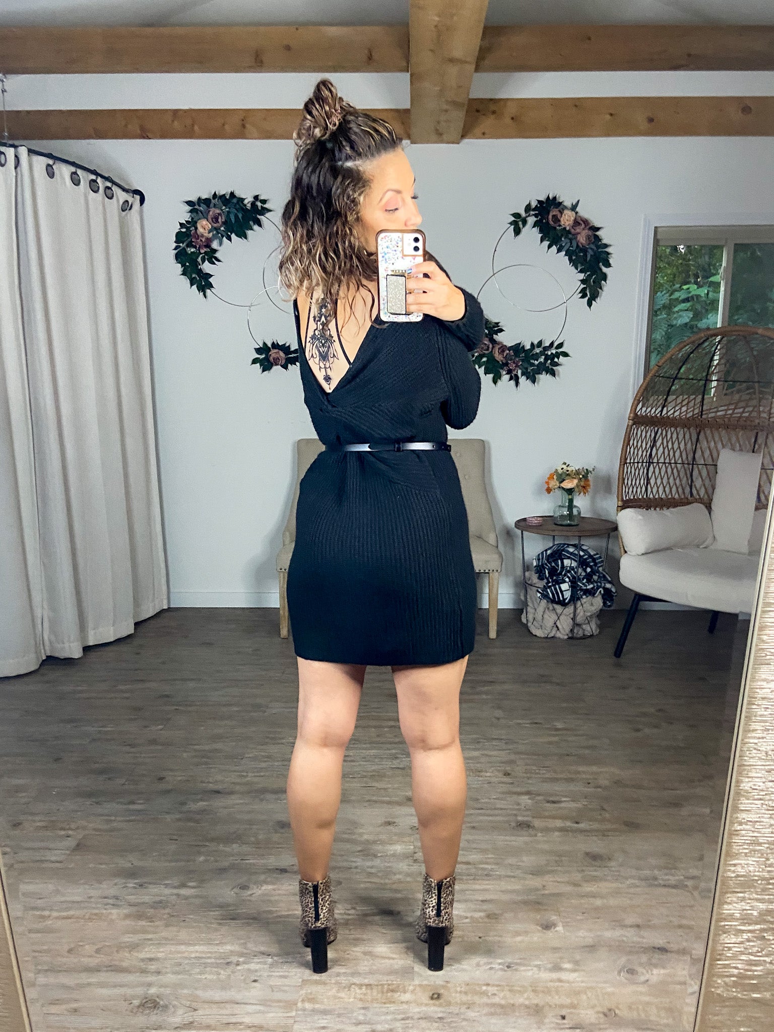 Our favorite twist back sweaters are now in dresses!! Features a stretchy, ribbed and medium sweater fabric that is breathable and comfy. Pair with boots, booties or dress it down with sneakers. Nikki is wearing the size small here. True to size or size up and belt it for a different look. Click here to watch the fit video.