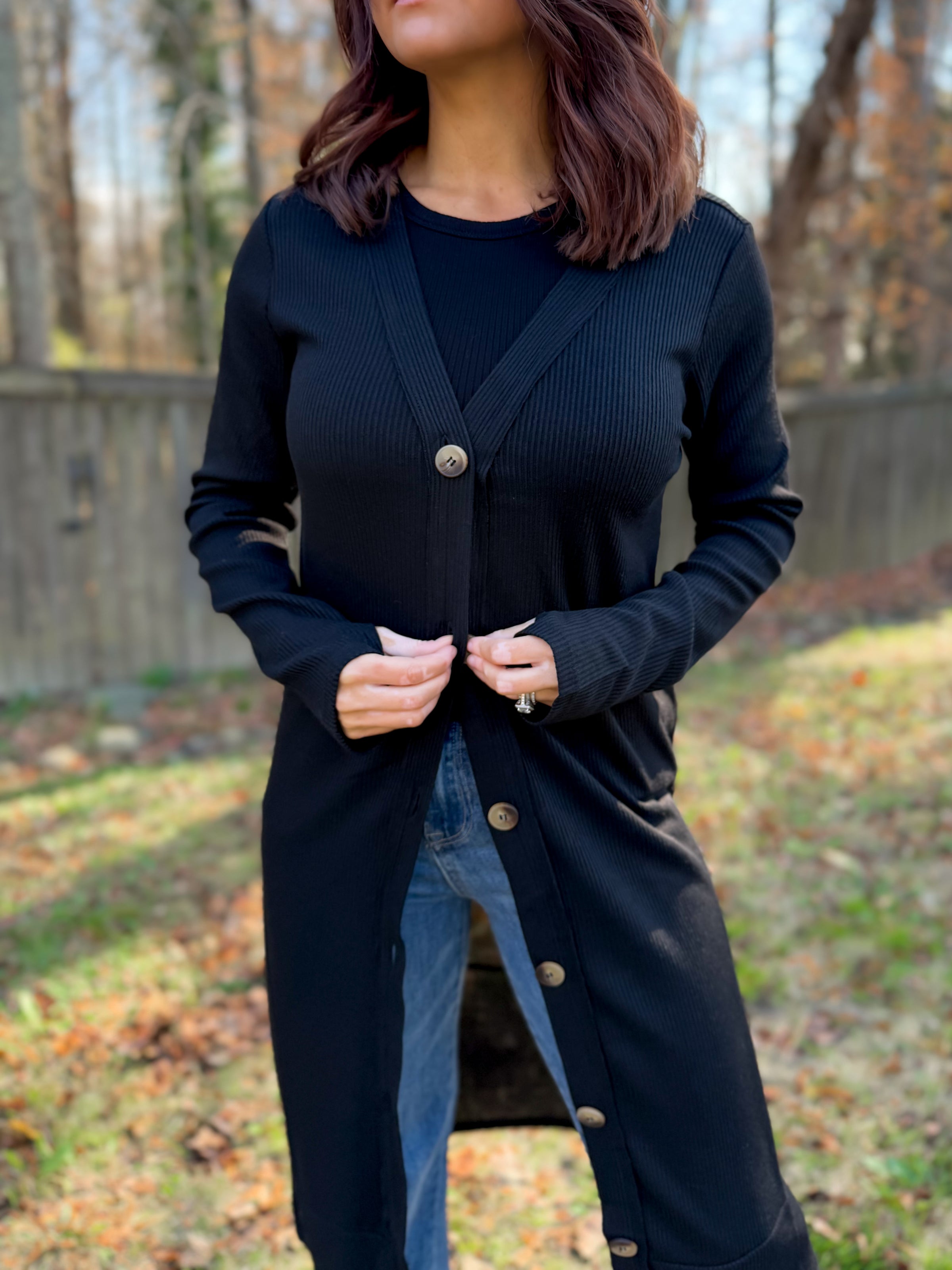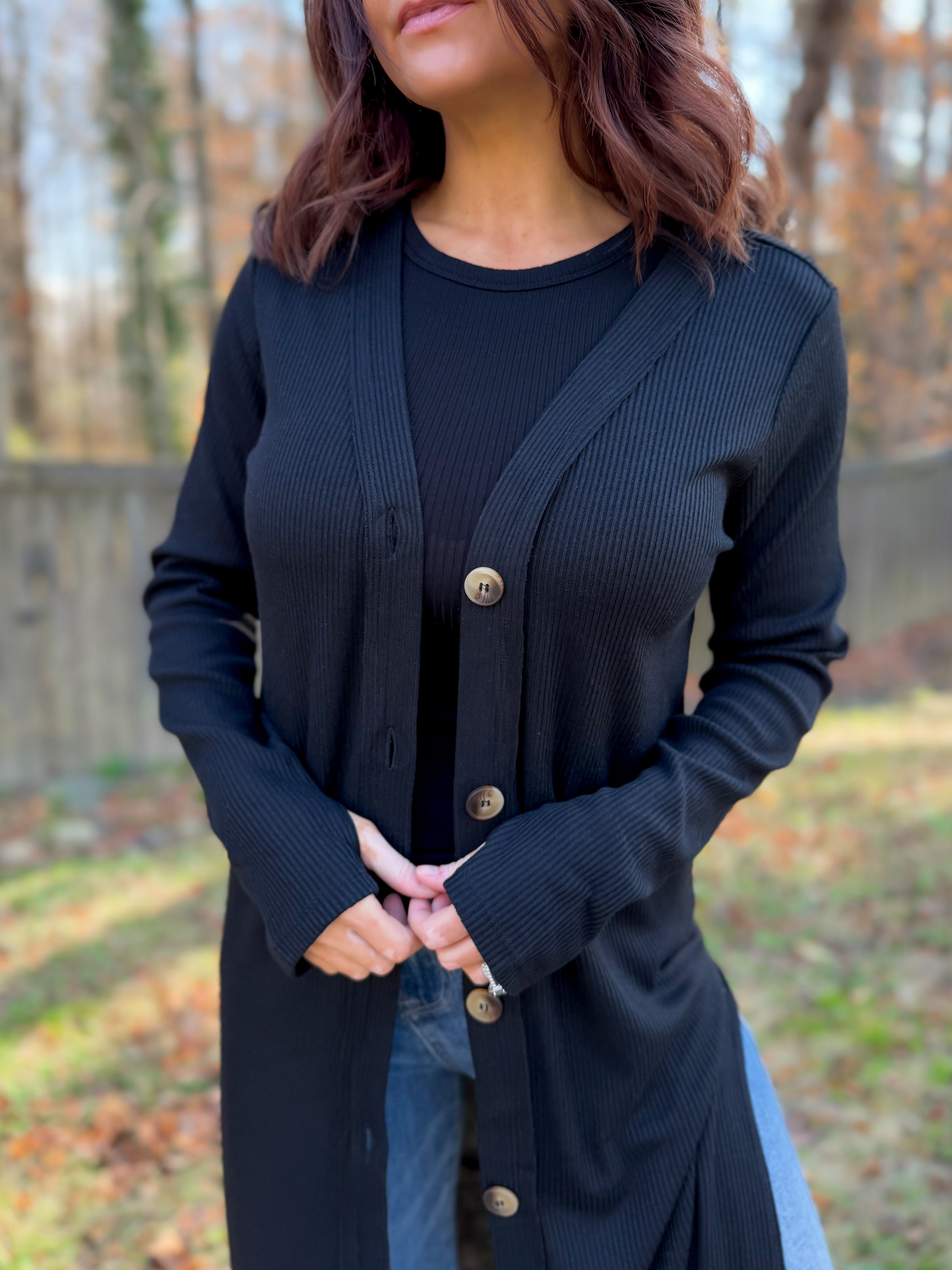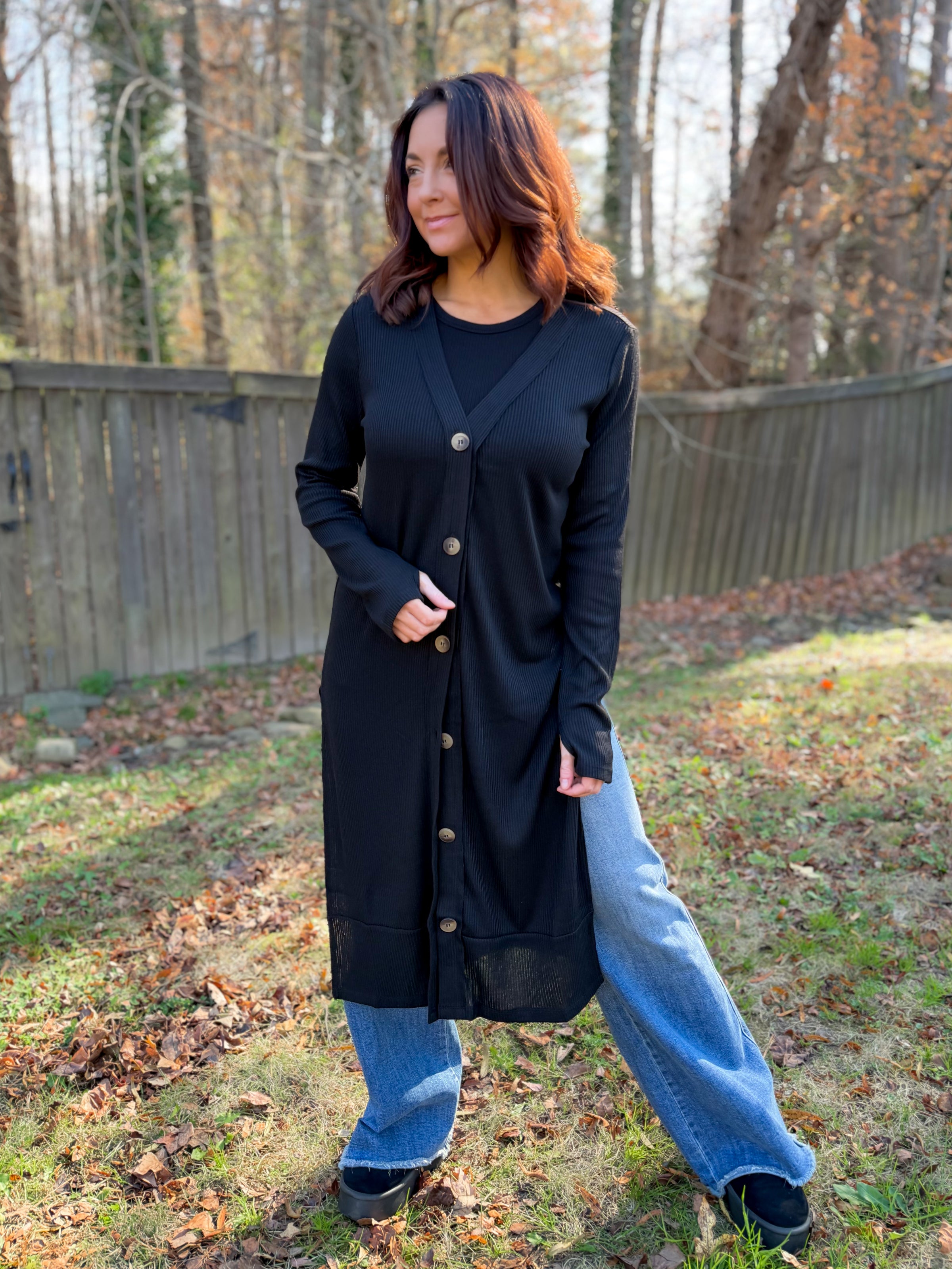 This cardi is duster length with side slits, so good! Features full functional buttons and the lightweight, waffle knit fabric is great for all seasons. Loose fit, stretch and true to size.
