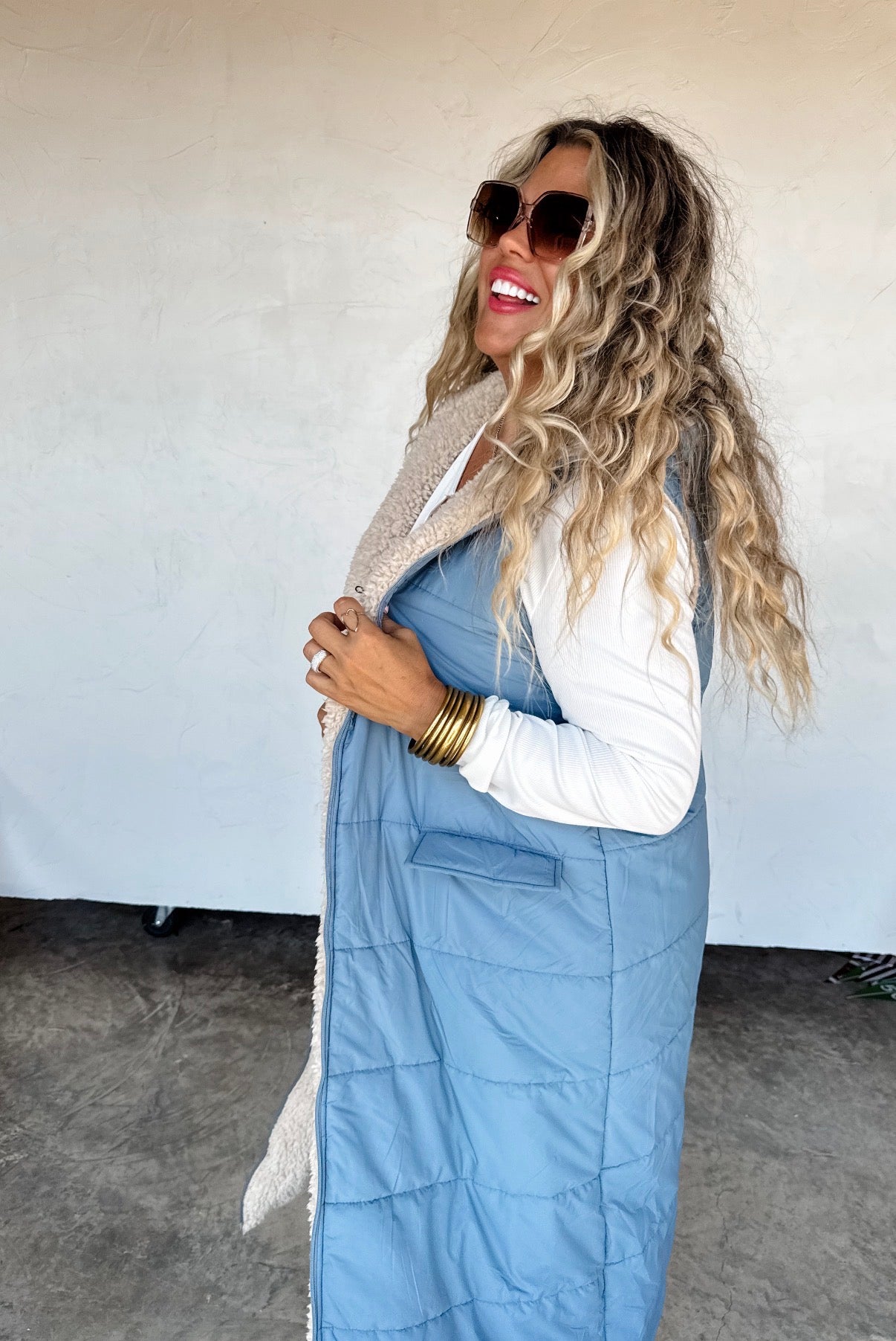 Stay warm in bold style with the ultra-cozy long sherpa puffer vest. Quilted puffer on one side, or wear it reversed with the sherpa side facing out! Features side pockets on the puffer side with a full zipper. Reverse the vest to wear the sherpa on the outside featuring a front detail zipper pocket on the front. Perfect for layering over your favorite basics for a cool, casual look.