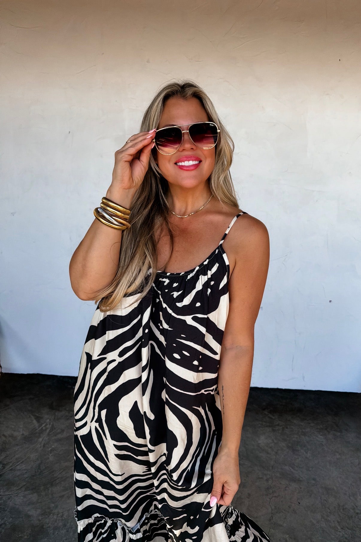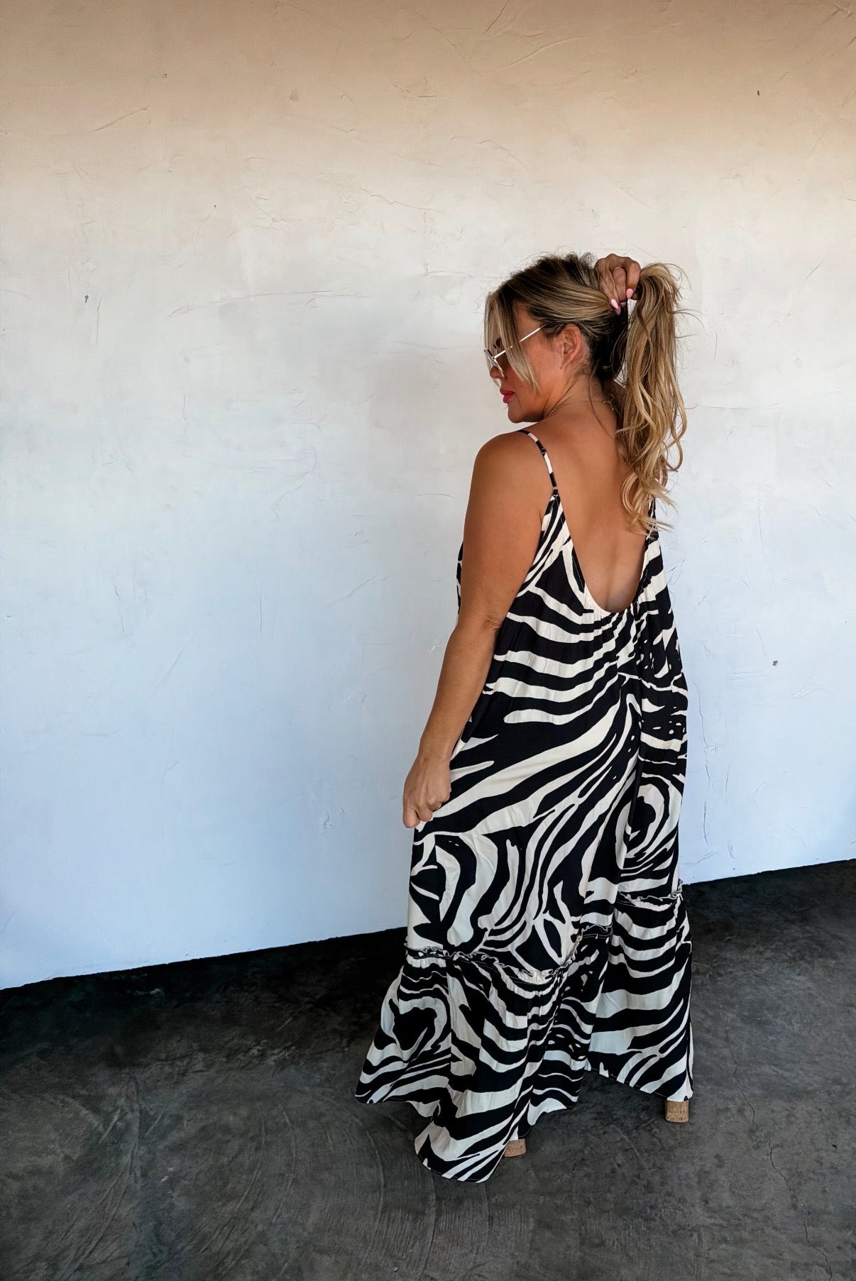 This beautiful dress will have heads turning! Flowy and oversized with adjustable straps, a low draped back and ruffle bottom. Made from luxury rayon fabric, you'll want to wear this dress all Summer long!