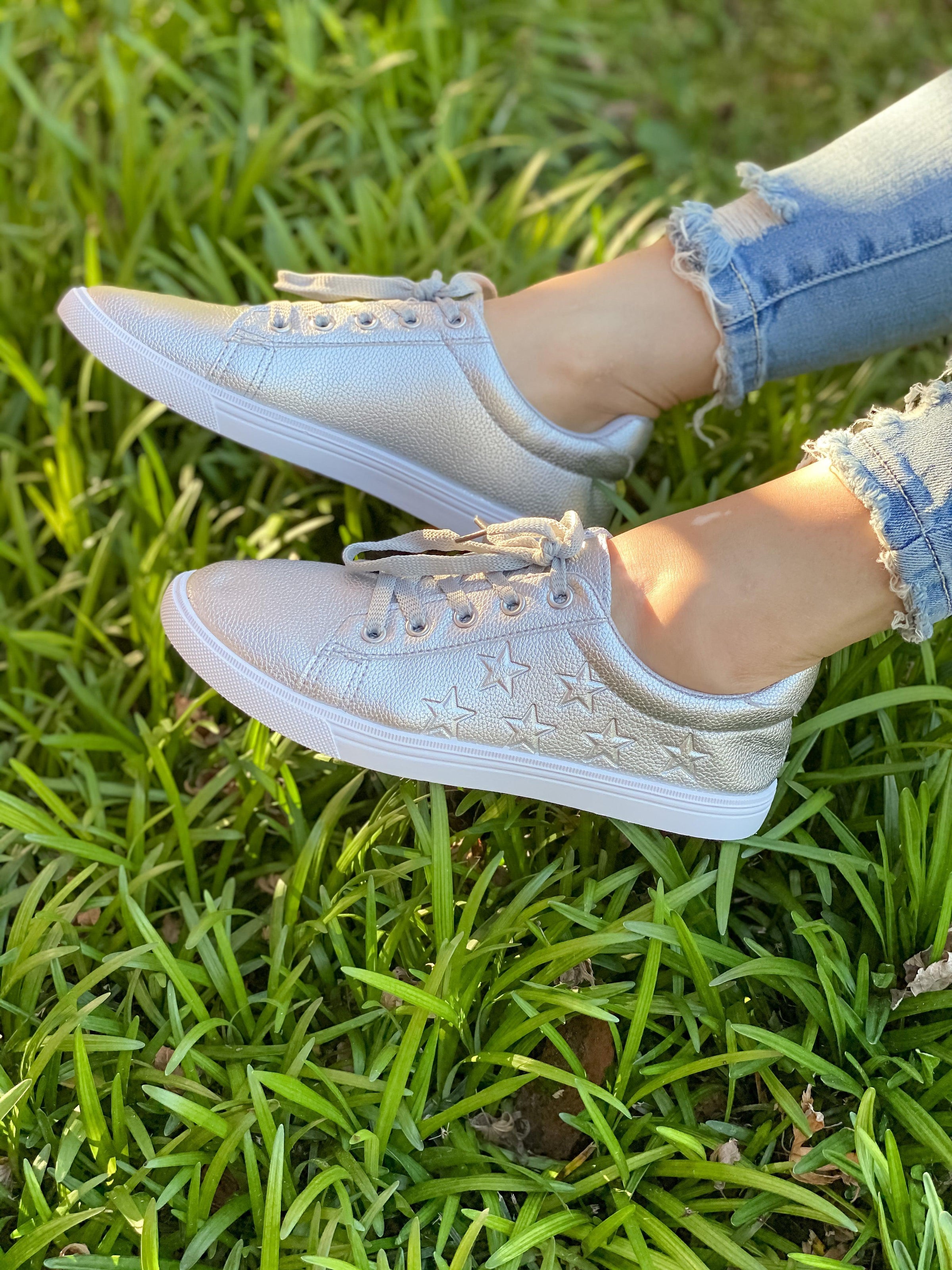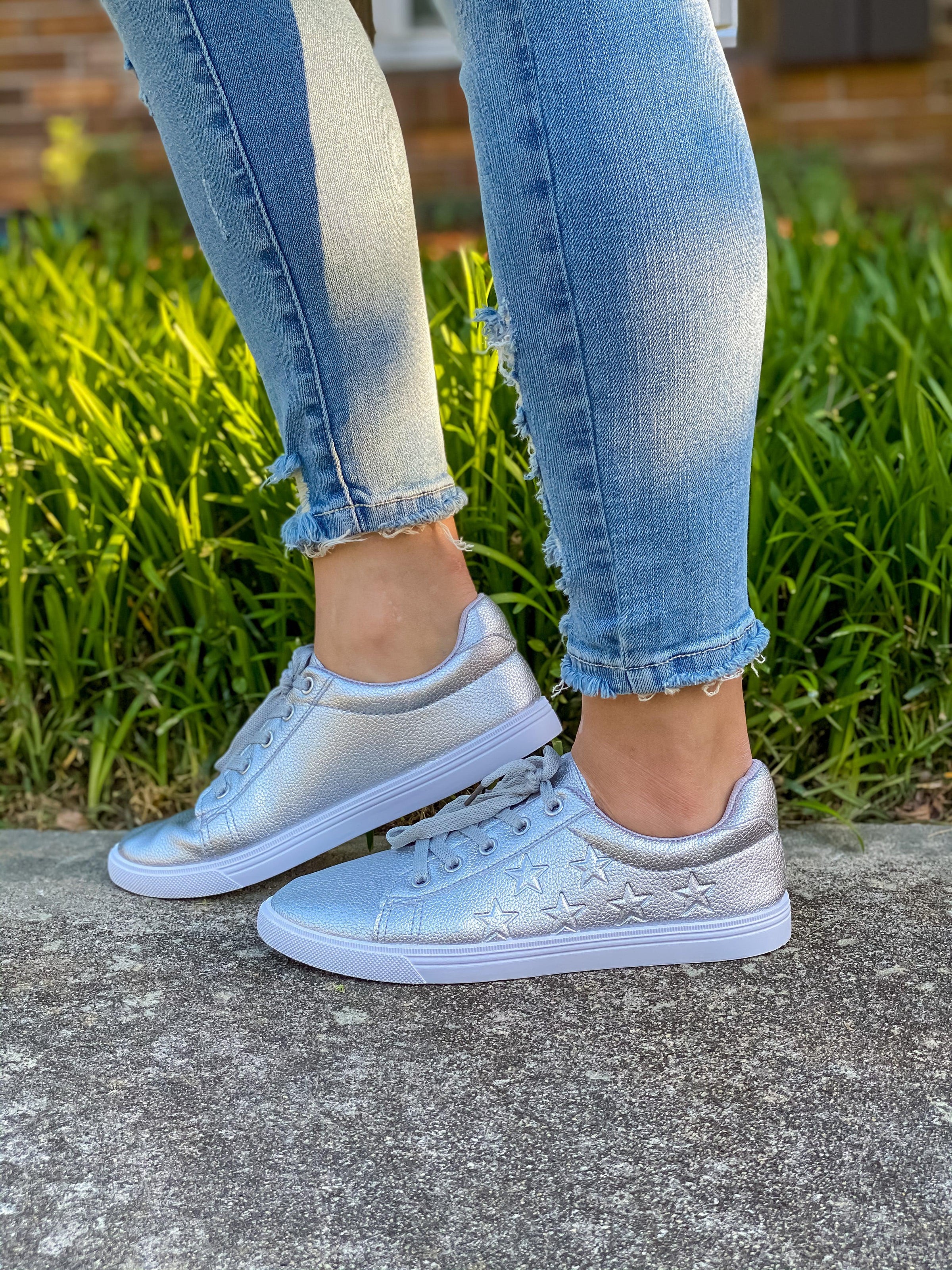 We are loving these edgy but simple sneakers. They are a pretty silver metallic color, lightweight and feature a cute star print on the side. Dress them with everything from flowy dresses to shorts and leggings. True to size but size up if in between sizes since these do not come in half size.