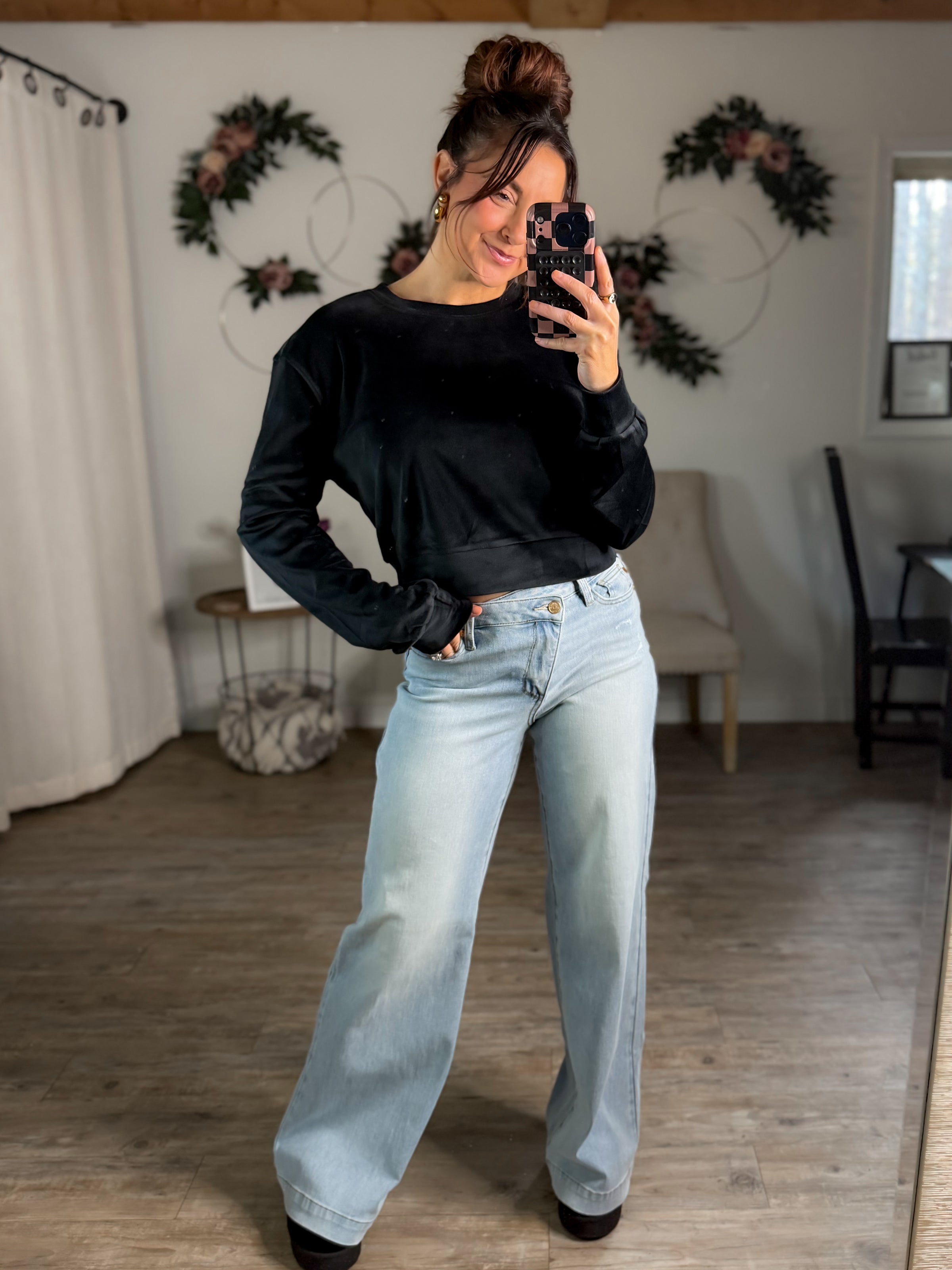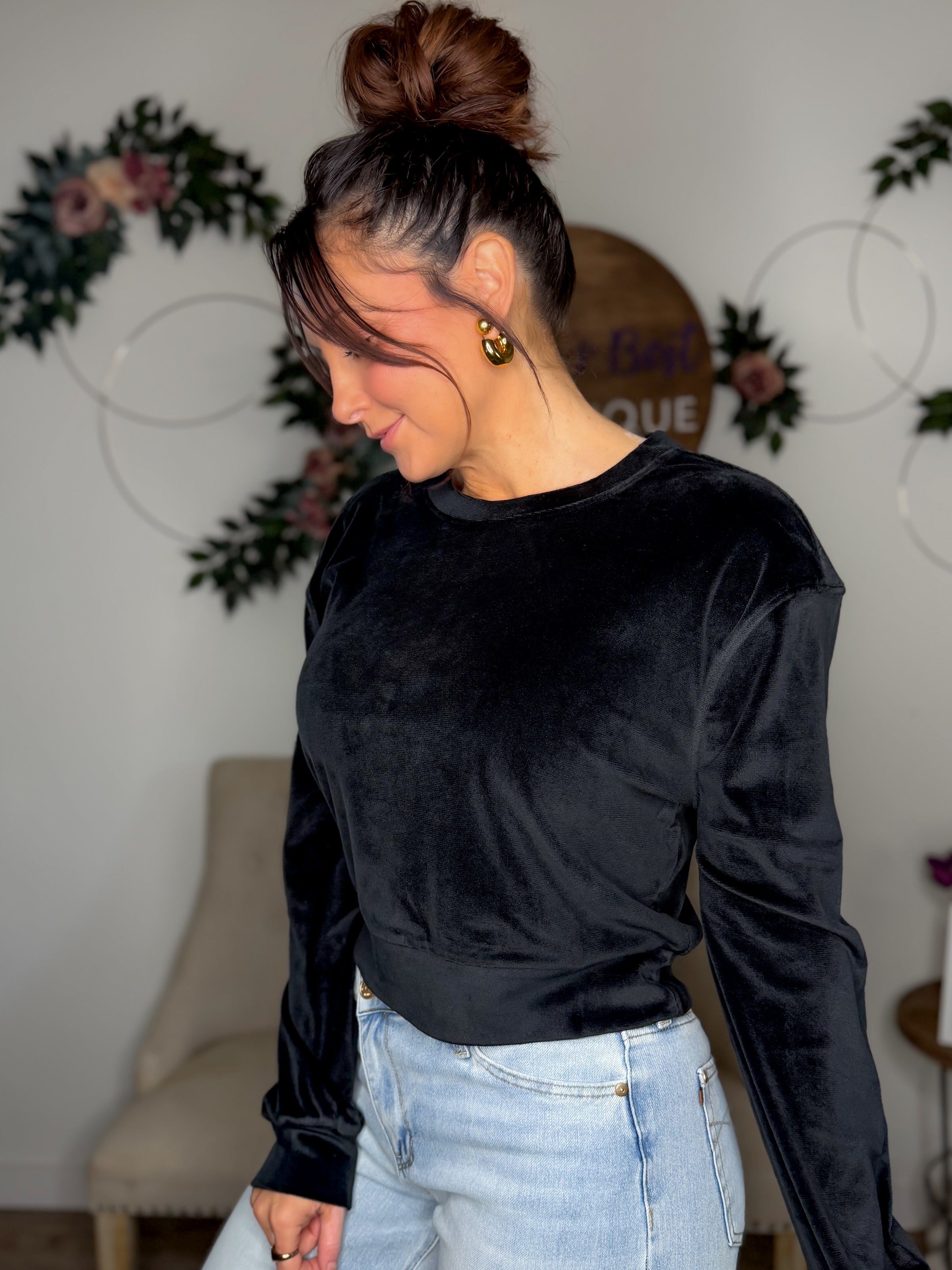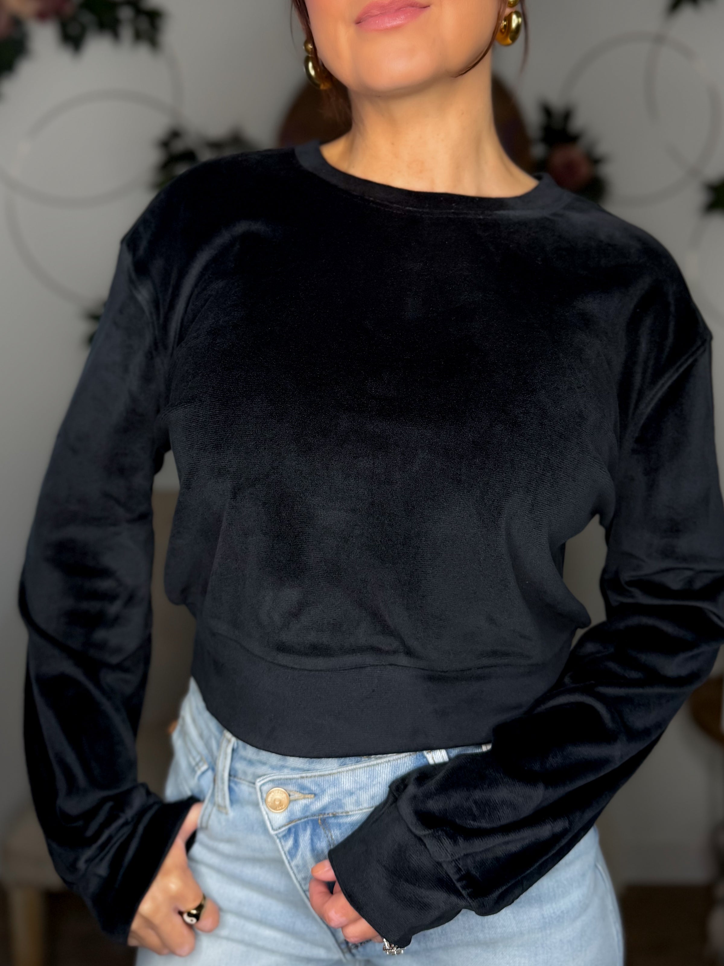 Experience the ultimate comfort and style with our Best In Class Velvet Top. Made from the softest velvet fabric, this top hits at the hips and offers a stretchy, easy-to-wear design. Perfect for pairing with leggings, sweats, or jeans, you'll feel confident and cozy all day long. True to size, Nikki is a size small