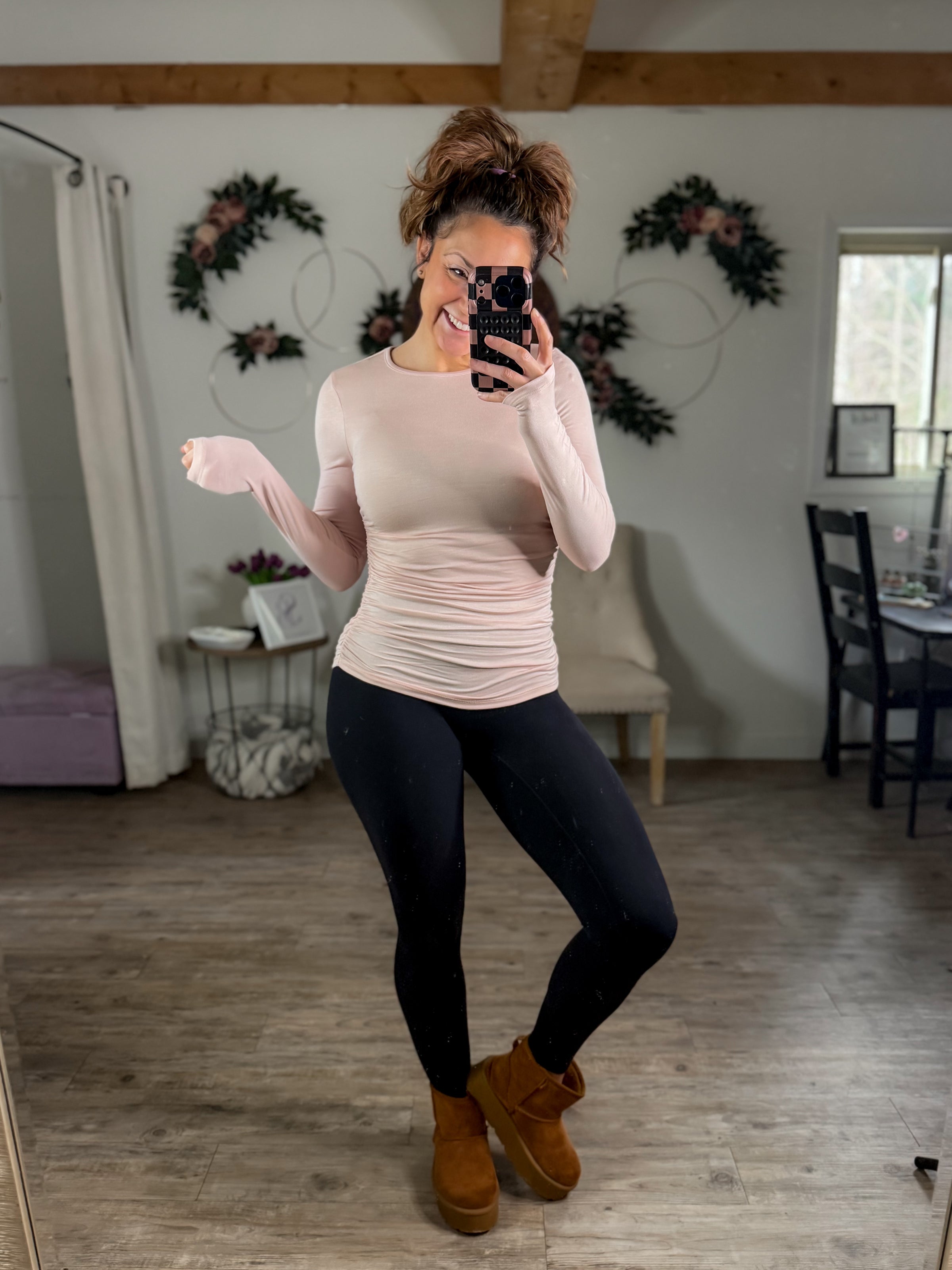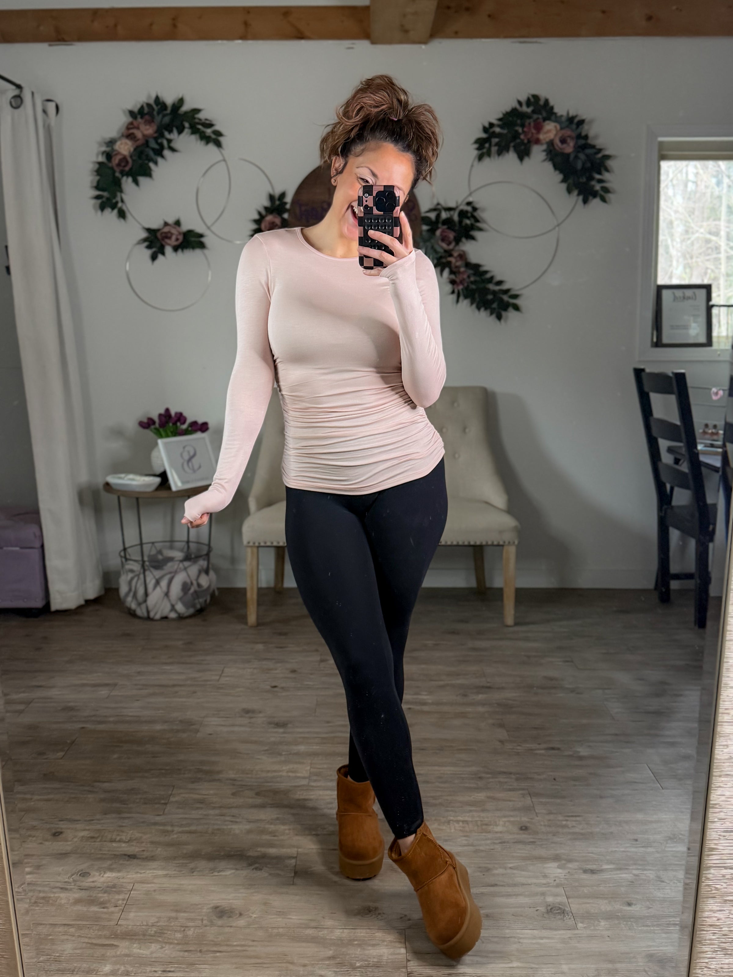 Side ruched, super stretchy and great length. This top is versatile from sweats and leggings to jeans AC and shorts. Lightweight,