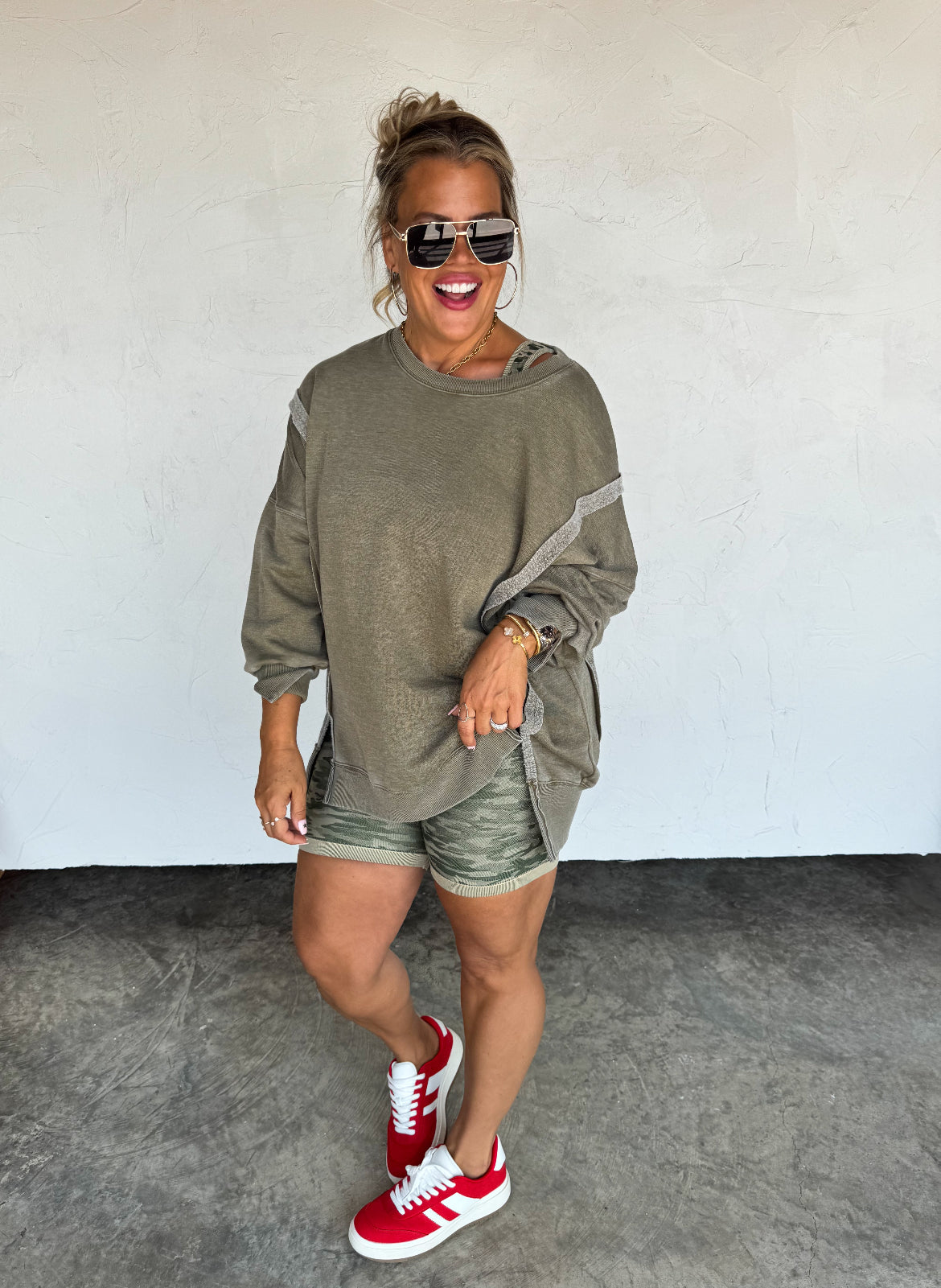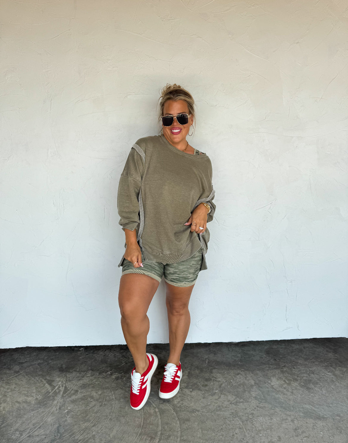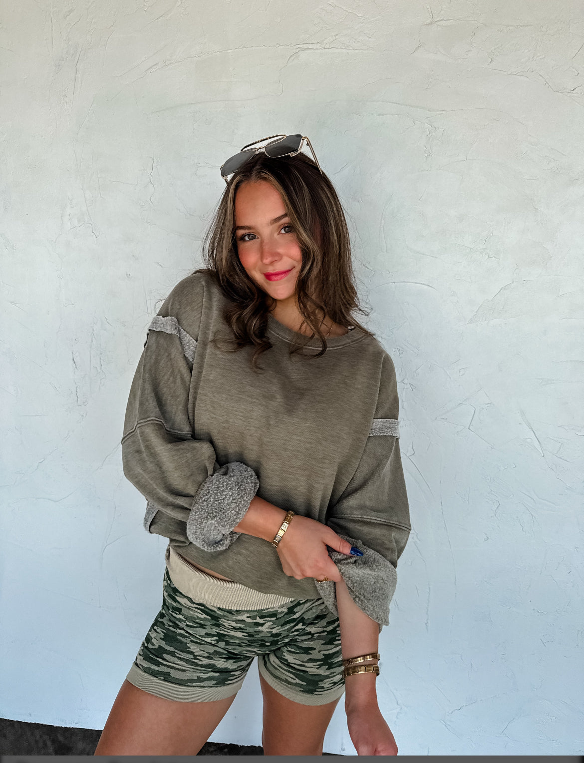 We spared no attention to detail in our new mineral washed sweatshirt! This forever timeless pullover is a slouchy, relaxed fit with exposed seaming, cute split cuff hem and ribbed trim detail! Has super soft "sweatshirt" feel on the inside!